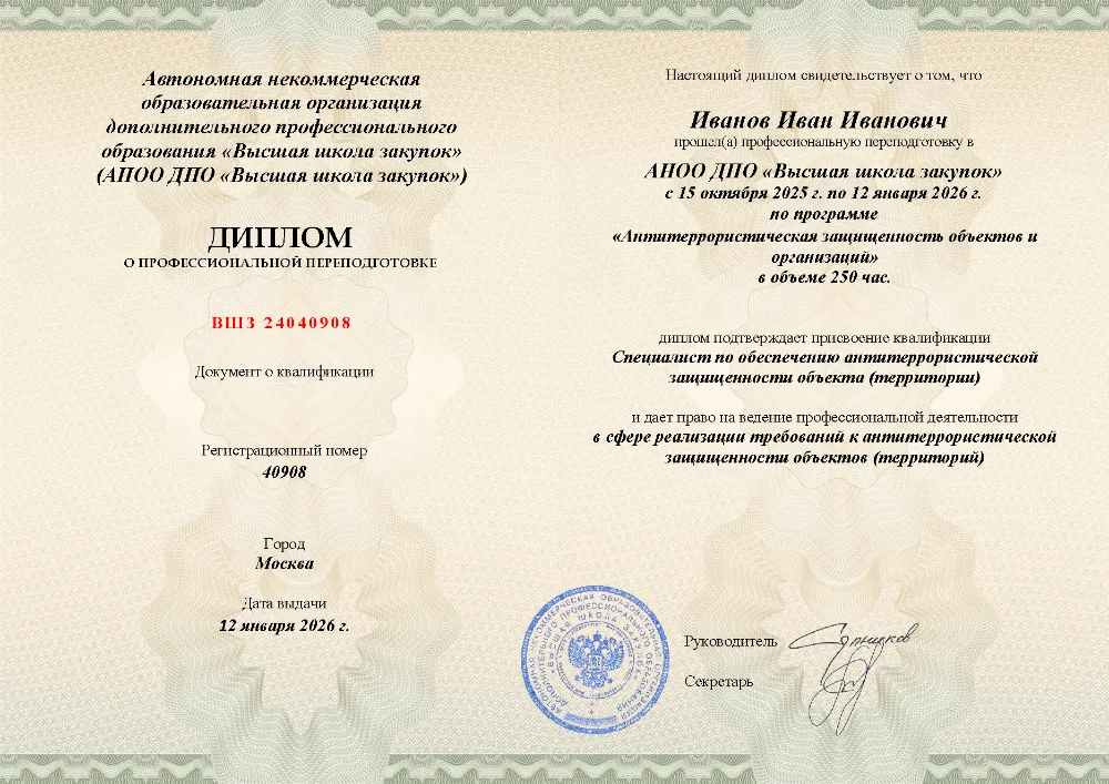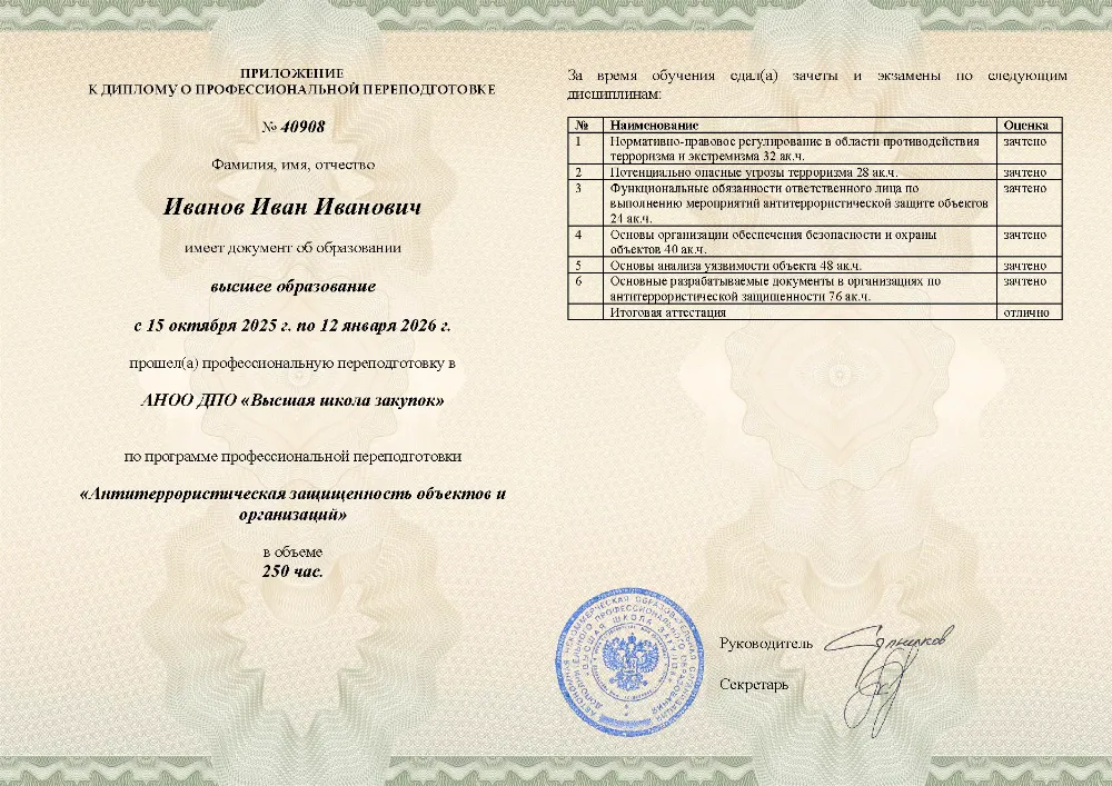 Профессиональная переподготовка, 250 академических часов, 6 модулей: нормативно-правовое регулирование и угрозы терроризма, функциональные обязанности ответственных лиц, основы безопасности и охраны объектов, анализ уязвимости и разработка необходимой документации. Онлайн-обучение в в Рязани с итоговой аттестацией.