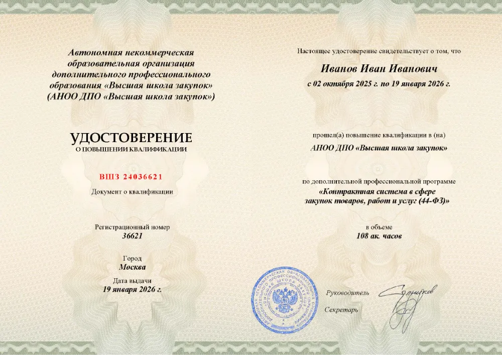 Повышение квалификации, 108 академических часов, 4 модуля: общие положения, принципы и планирование закупок по 44-ФЗ, процедура закупки у единственного поставщика, заключение, исполнение, расторжение и банковское сопровождение государственного контракта. Онлайн-обучение в в Рязани с итоговой аттестацией.
